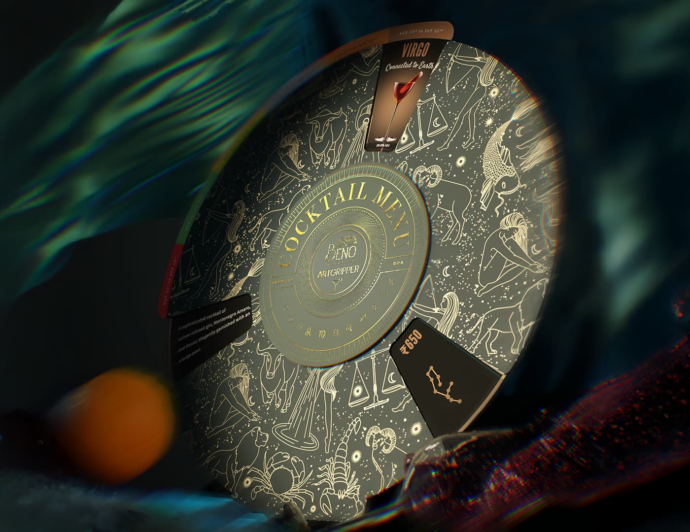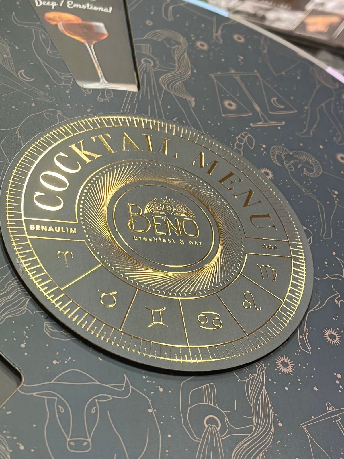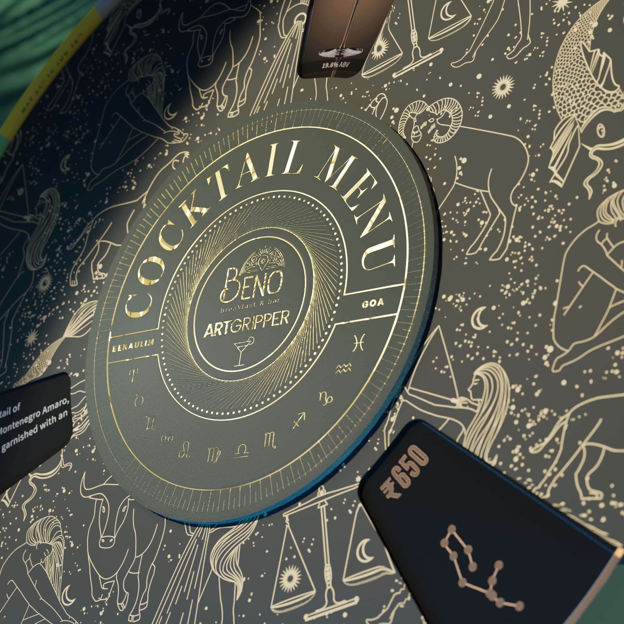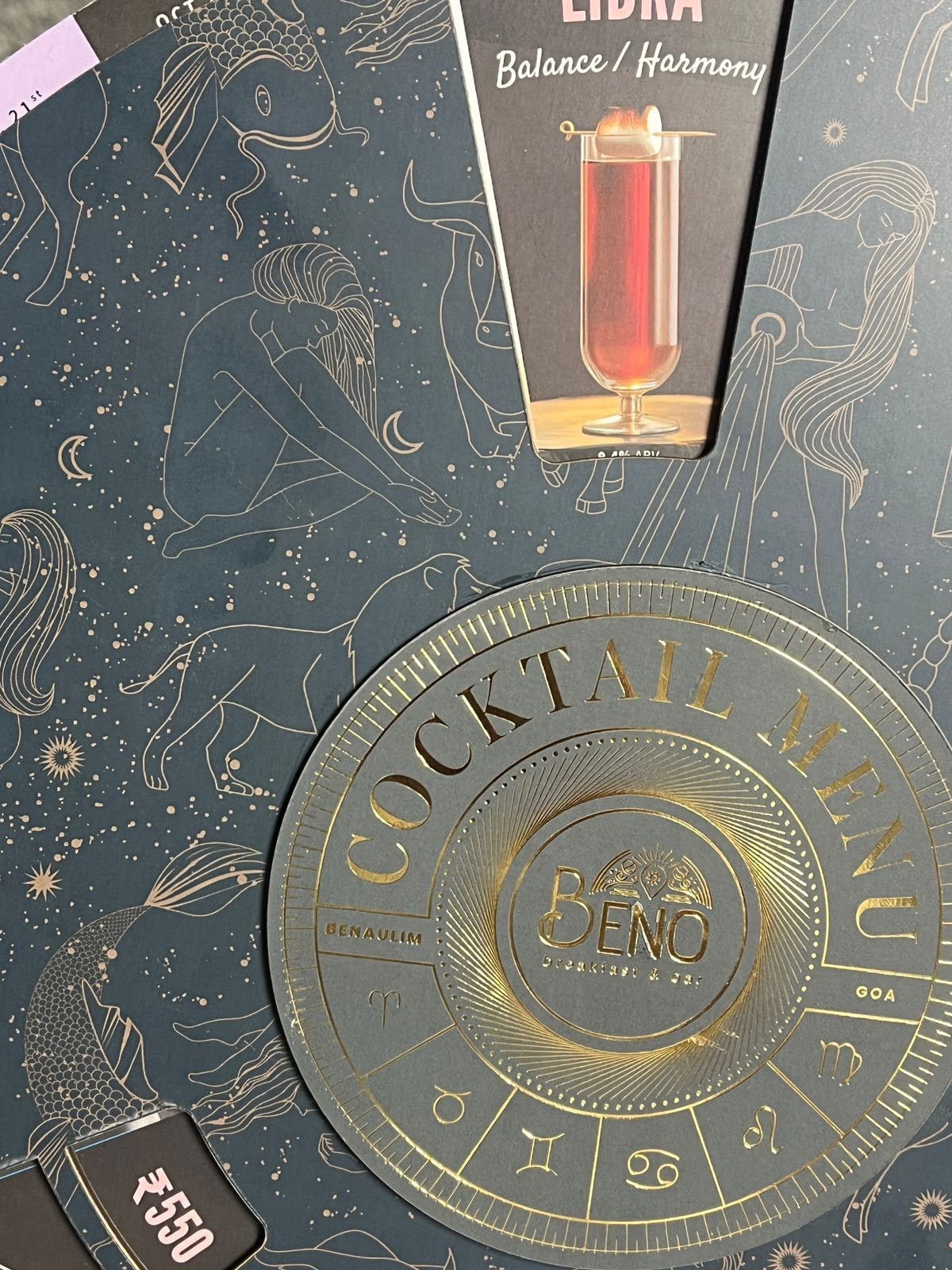 Beno Goa: Menu card design for a vibrant cafe with live music & outdoor seating. Focuses on fresh, local ingredients. Showcases 12 unique zodiac-inspired cocktails by mixologist Mr. Harshit Agarwal.