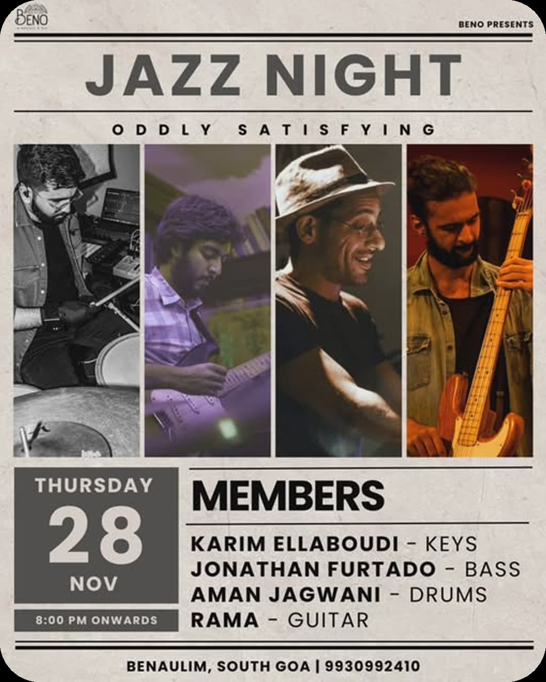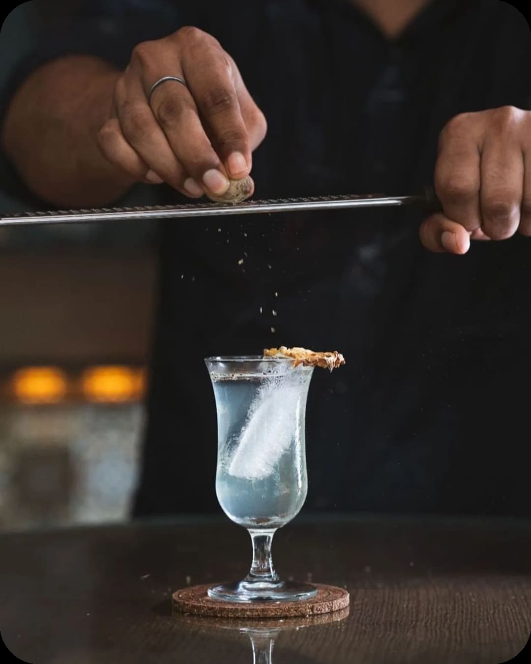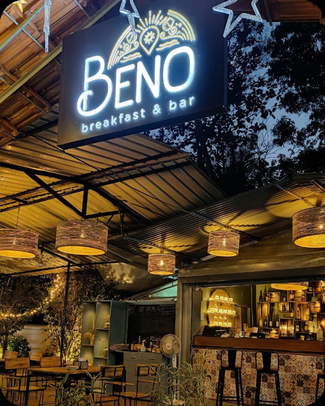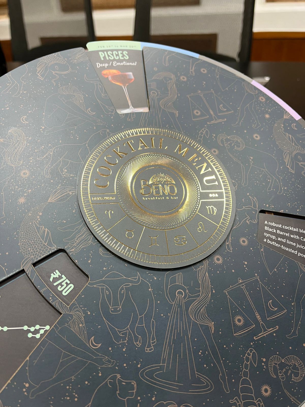 Beno Goa: Menu card design for a vibrant cafe with live music & outdoor seating. Focuses on fresh, local ingredients. Showcases 12 unique zodiac-inspired cocktails by mixologist Mr. Harshit Agarwal.