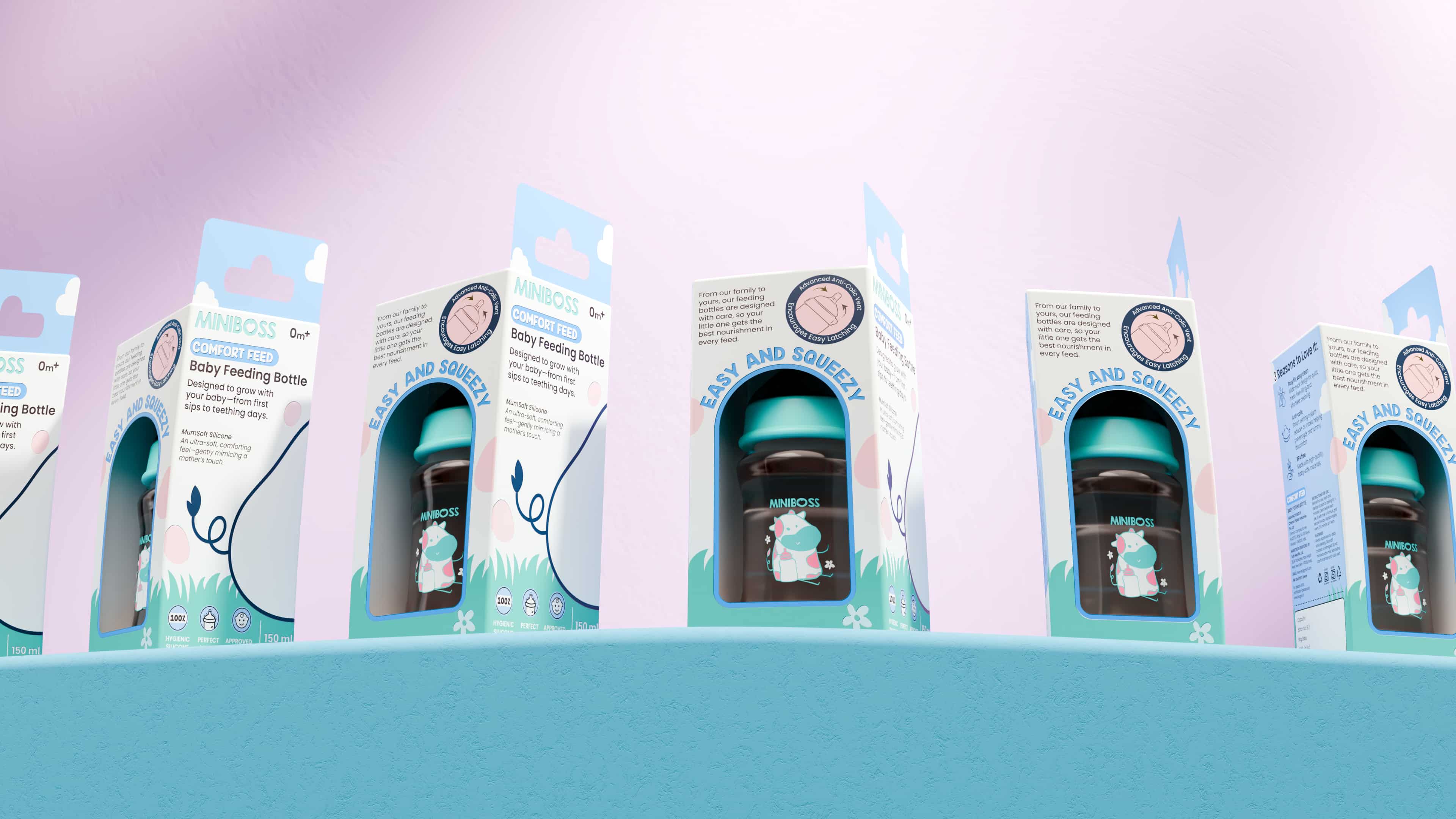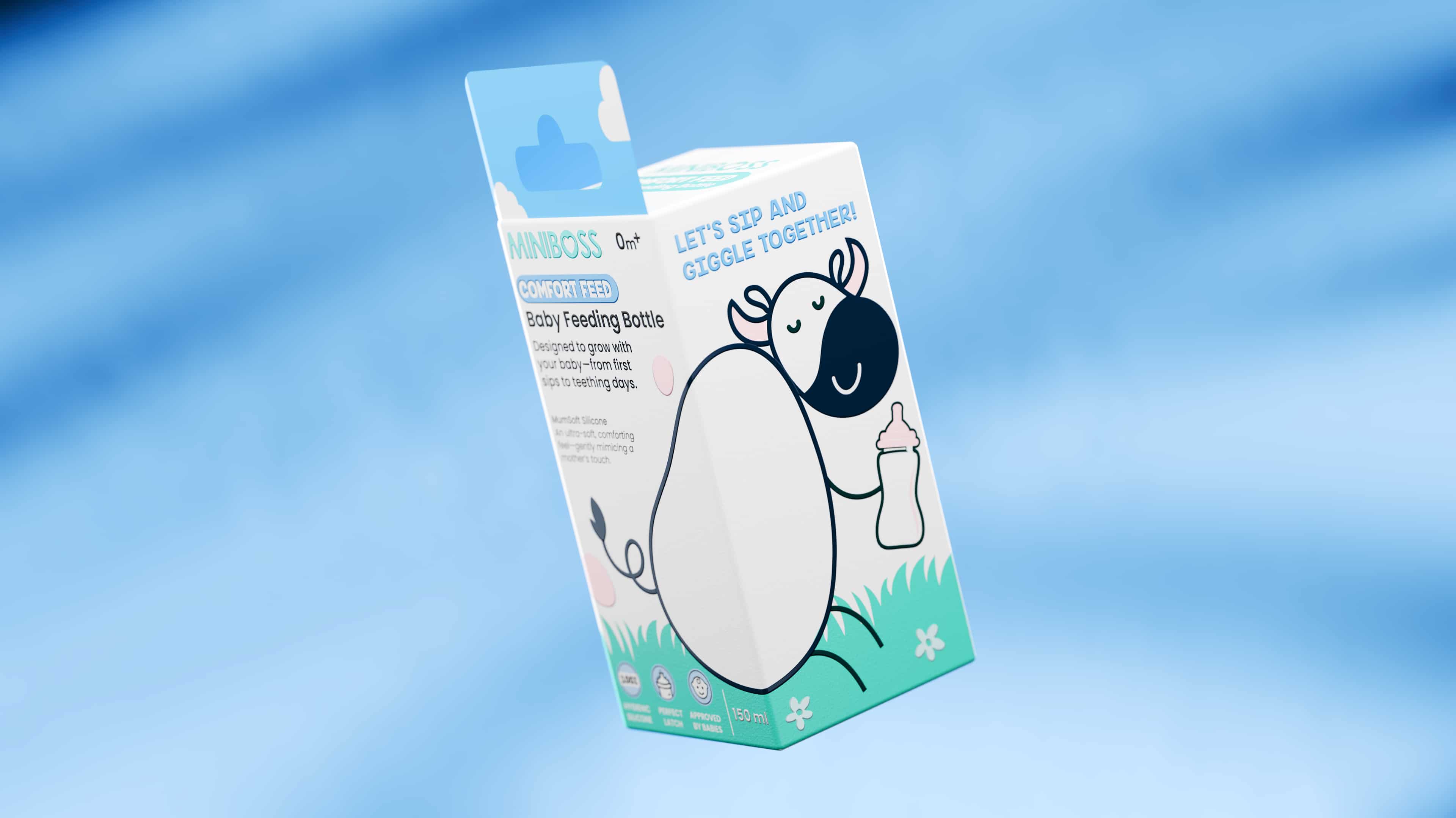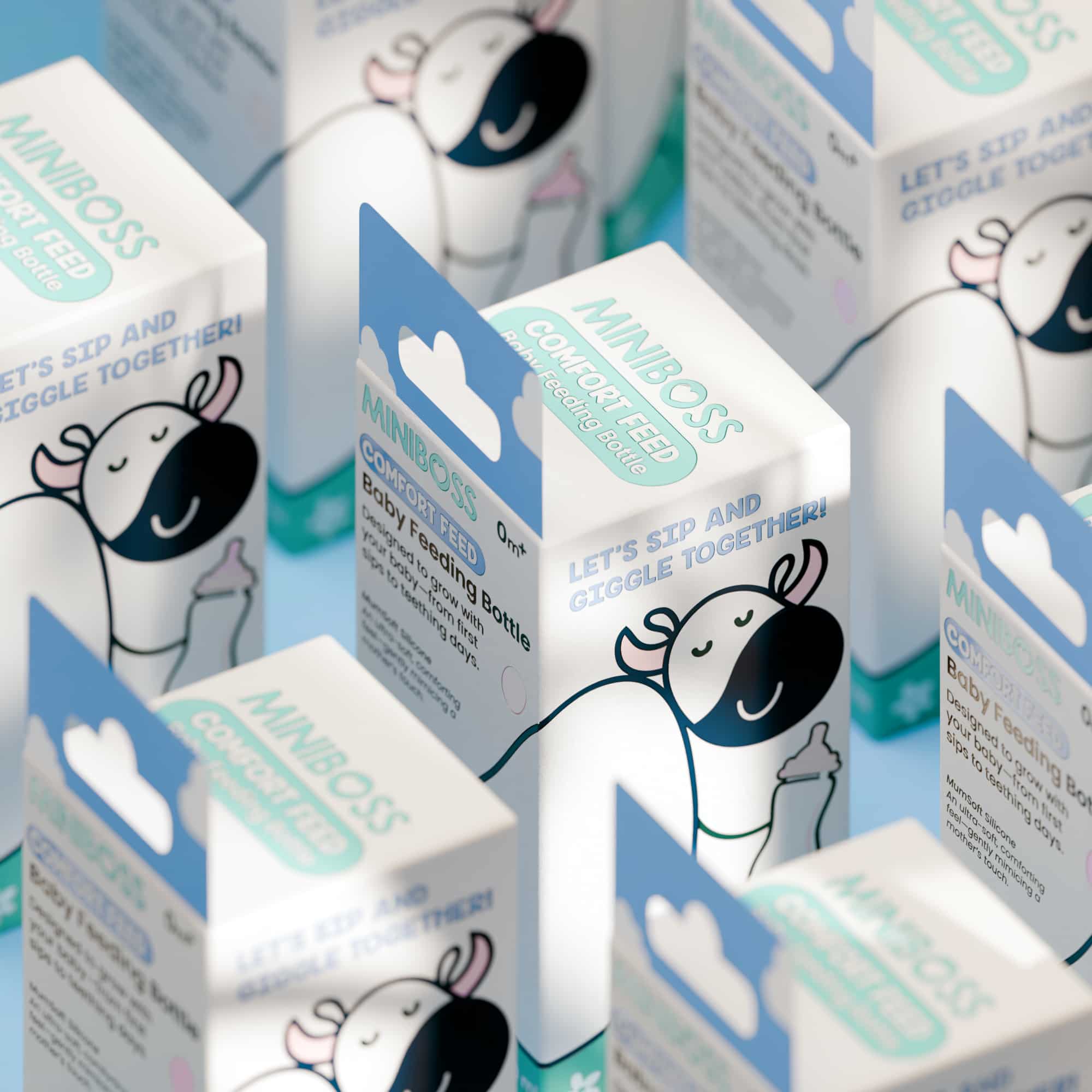 We partnered with MINIBOSS for its baby feeding bottle packaging, developing a clean, soft, and approachable visual identity tailored for young parents. The brief was clear, the client wanted a creative, playful packaging design that still communicated trust and safety.