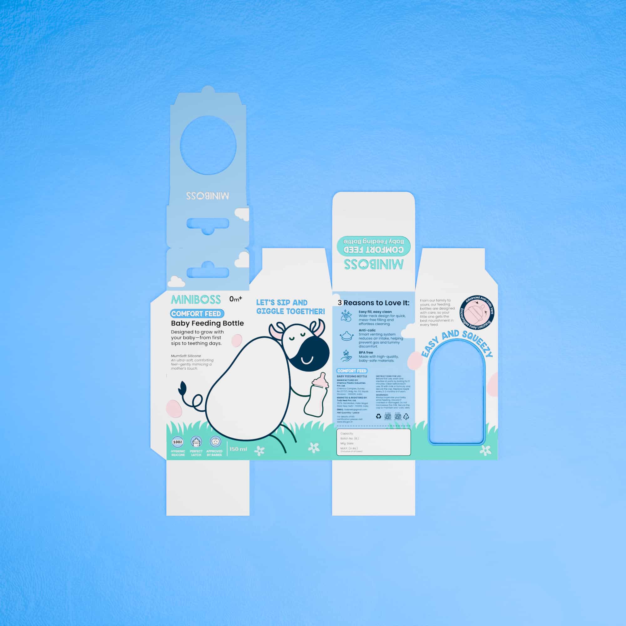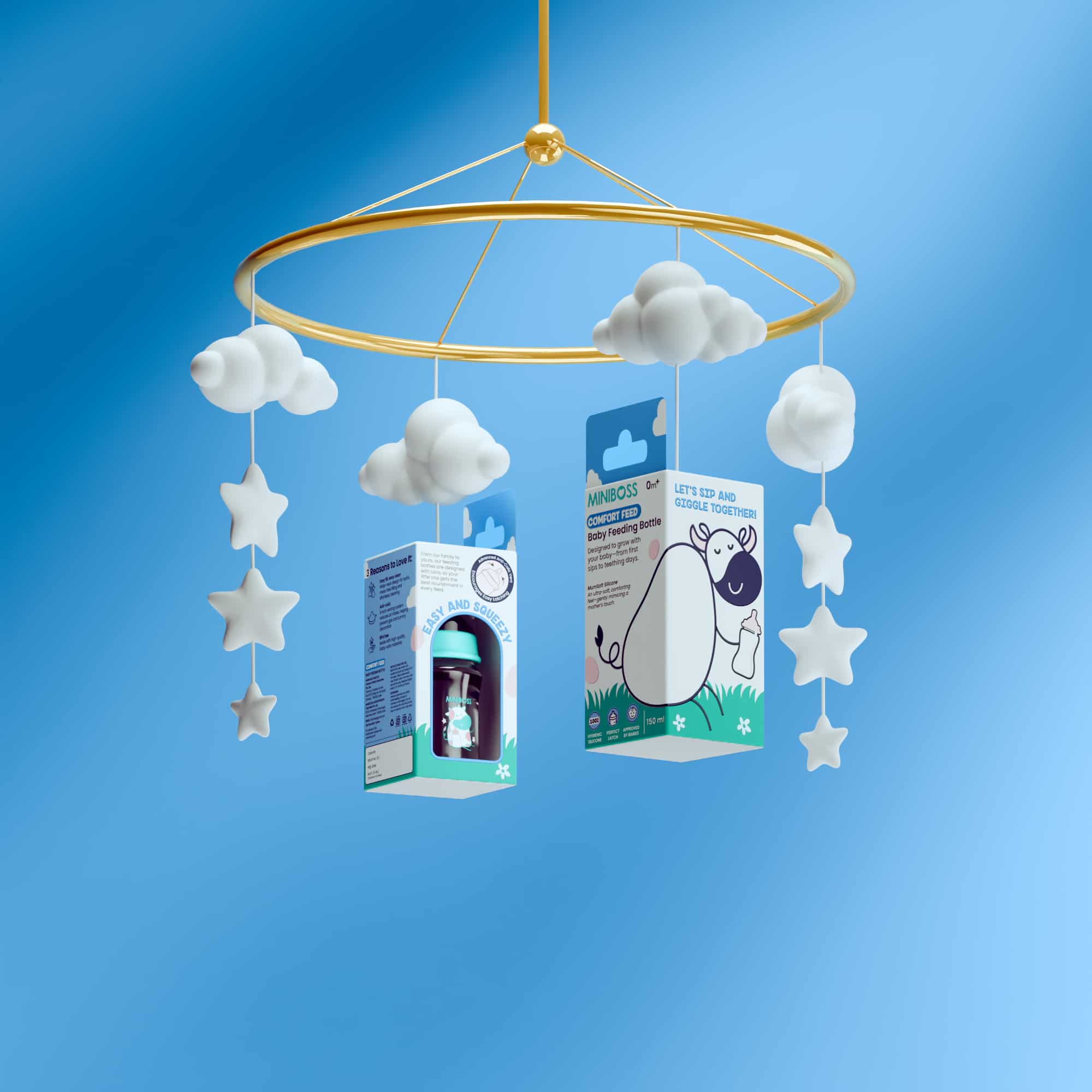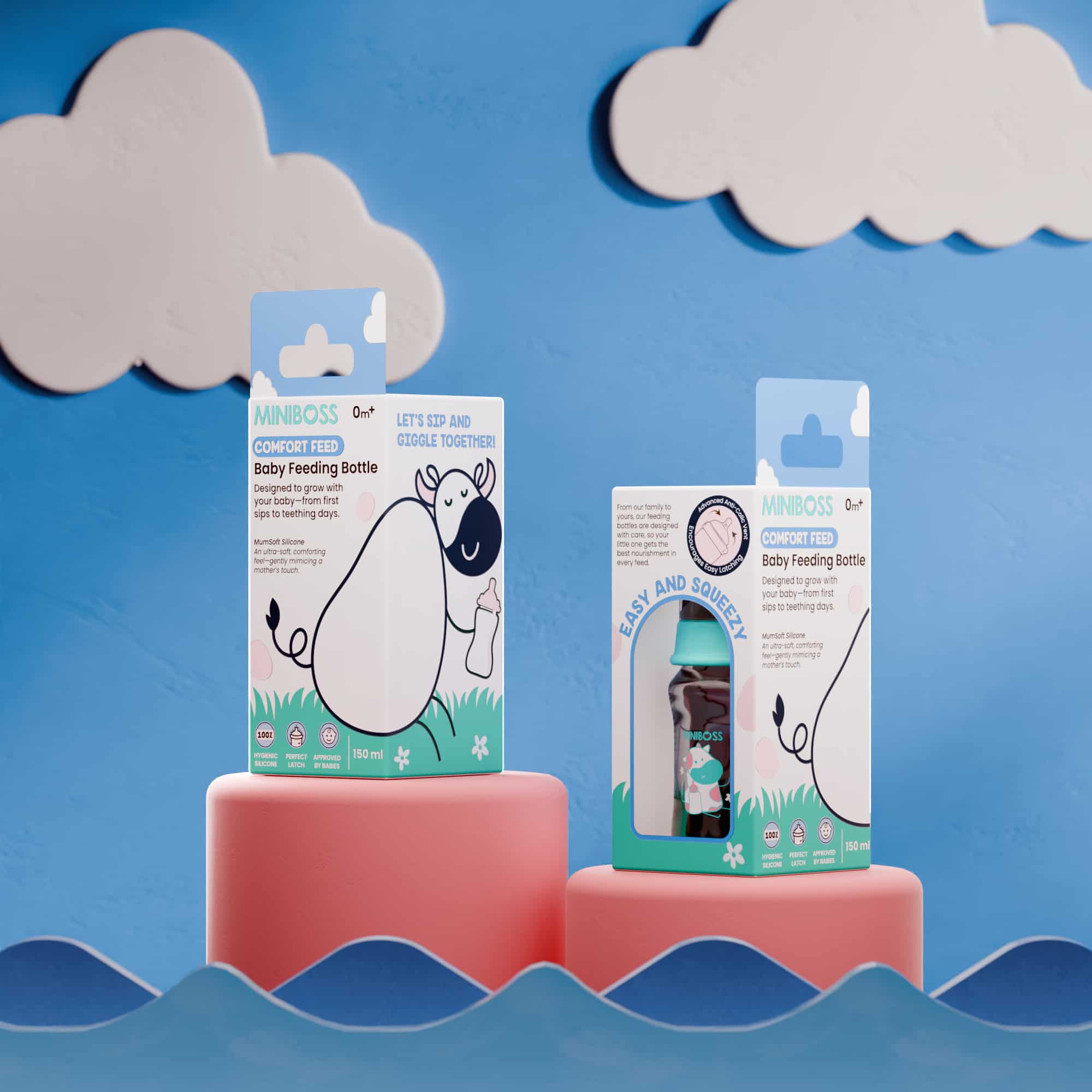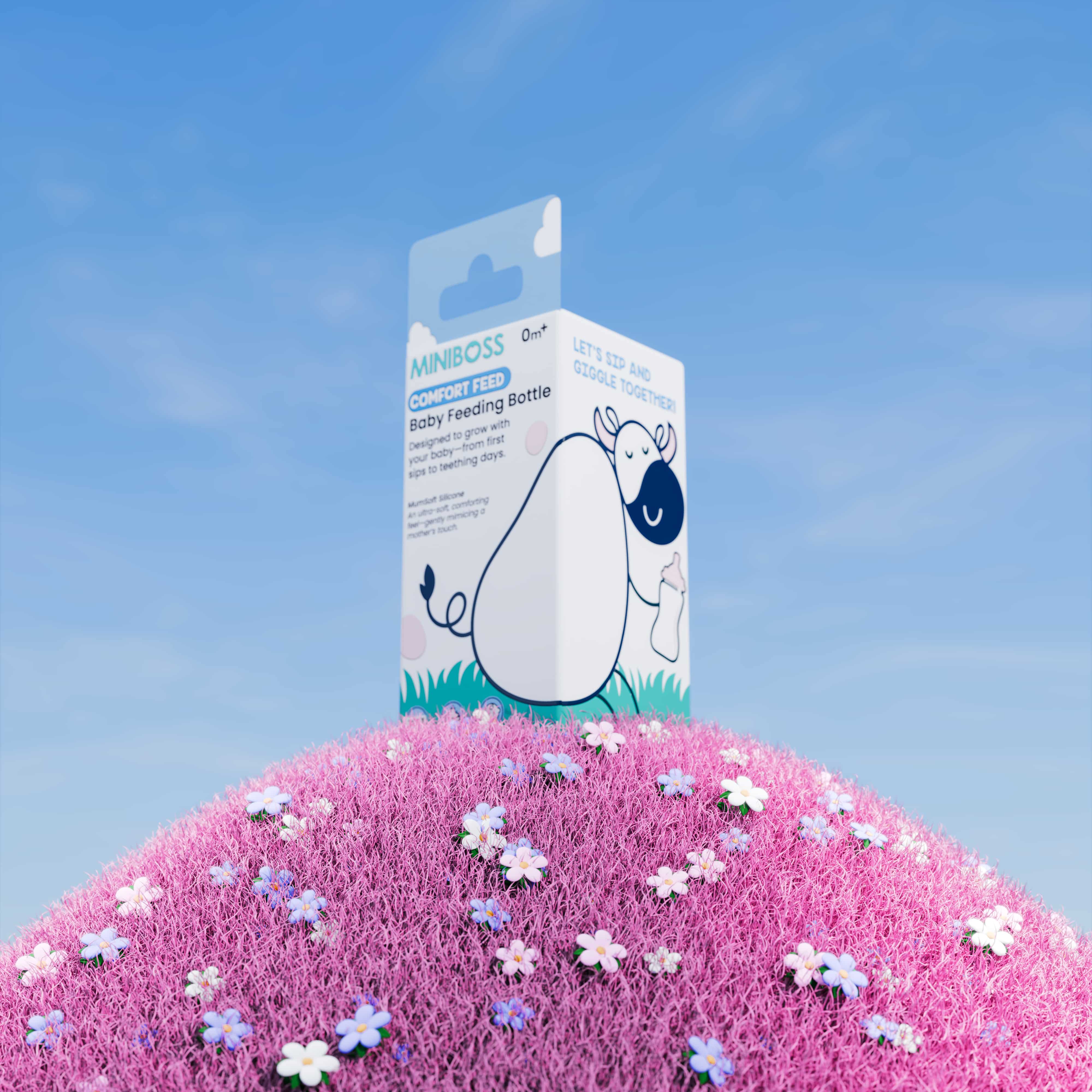 We partnered with MINIBOSS for its baby feeding bottle packaging, developing a clean, soft, and approachable visual identity tailored for young parents. The brief was clear, the client wanted a creative, playful packaging design that still communicated trust and safety.
